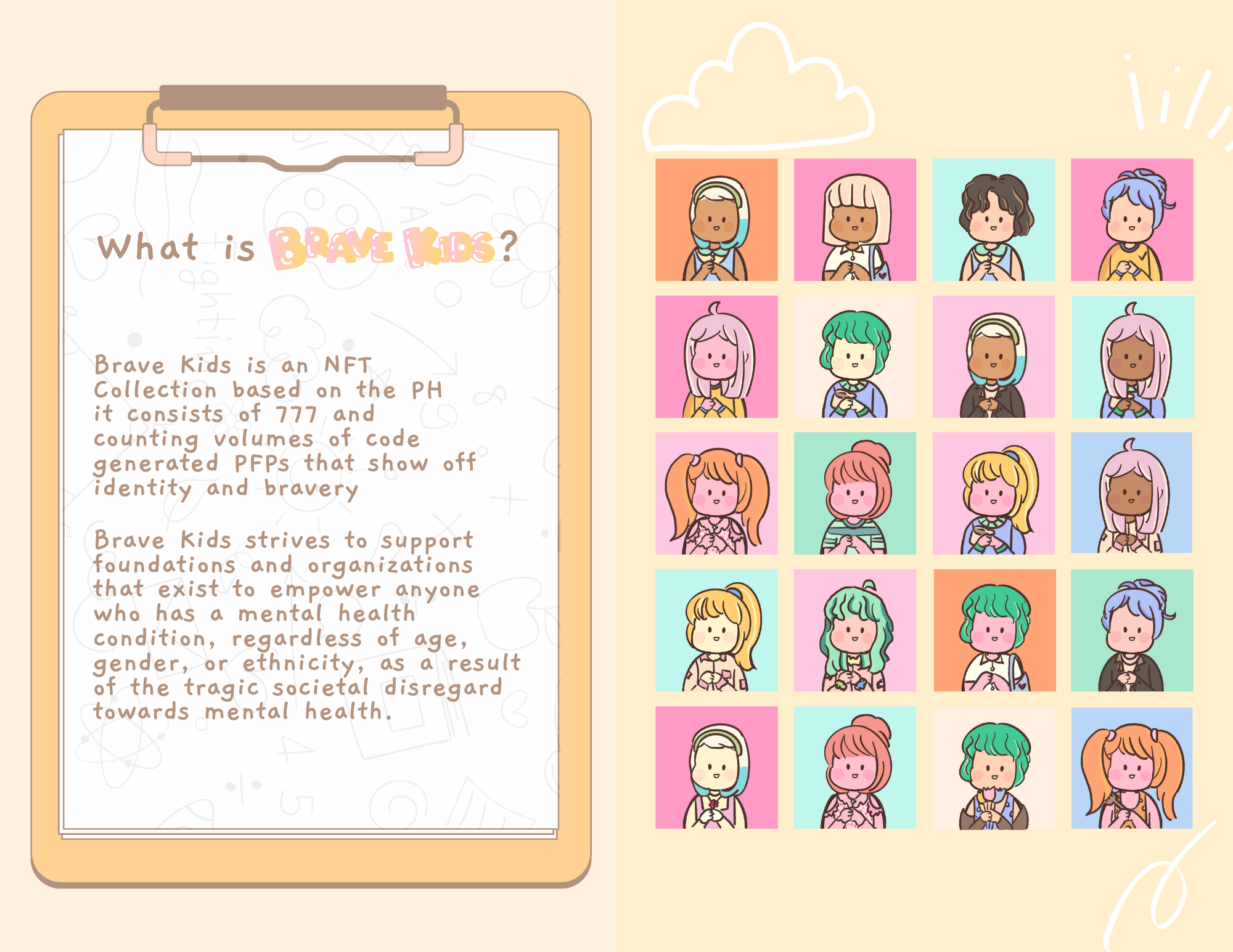 Brave Kids is an NFT Collection based on the PH it consists of 777 and counting volumes of code generated PFPs that show off identity and bravery. Brave Kids strives to support foundations and organizations that exist to empower anyone who has a mental health condition, regardless of age, gender, or ethnicity, as a result of the tragic societal disregard towards mental health.