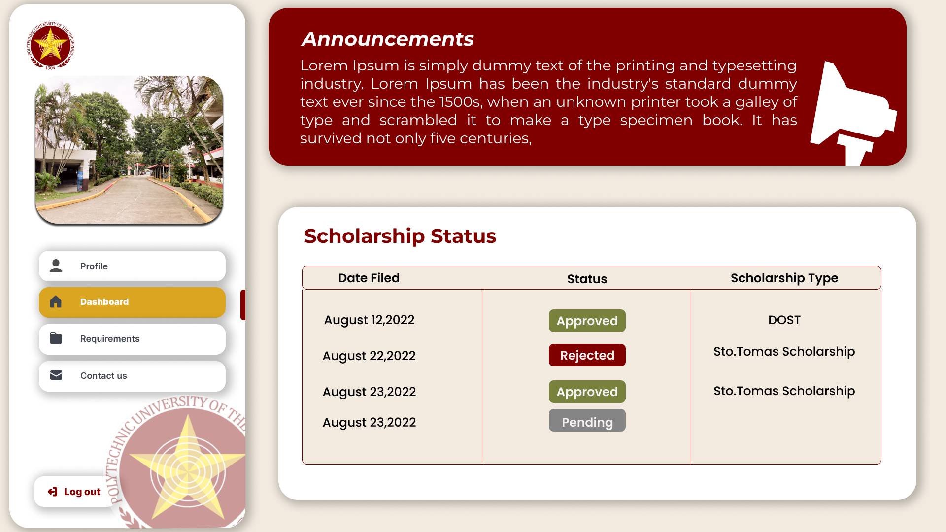 As per the client's request, we are tasked to create a Scholars Portal for the submission of scholarship requirements. This system was used to collect, store, and retrieve scholar's documents, as well as to sort them out to use time efficiently and to ease the load on the OSAS part in processing these documents.